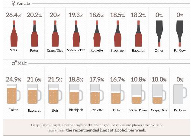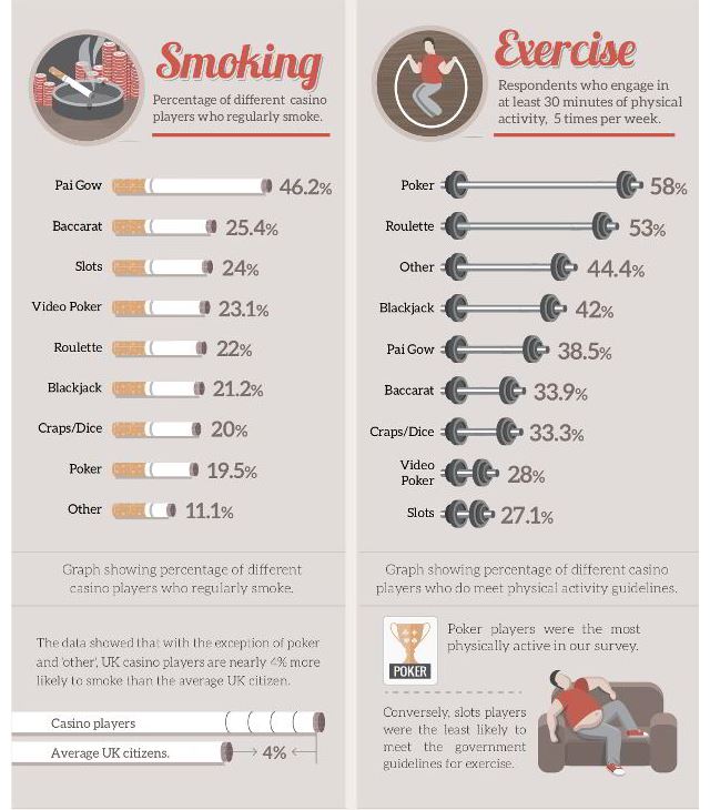 Los jugadores de póker son más propensos a beber alcohol que ningún otro jugador, presentando una media del 23% de personas que beben más que la media nacional, presentando un excesivo consumo de alcohol y superando el consumo semanal medio del resto, por otra parte los jugadores de póker son menos propensos a fumar y sus derivados que la media nacional.